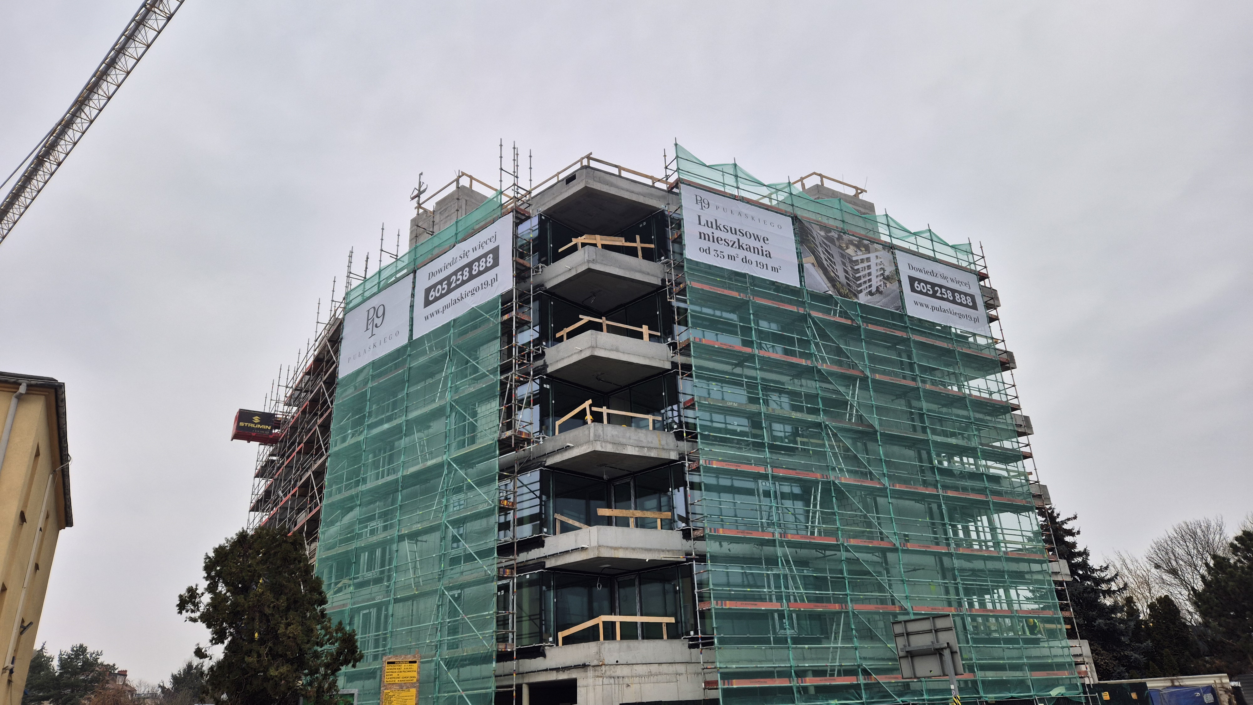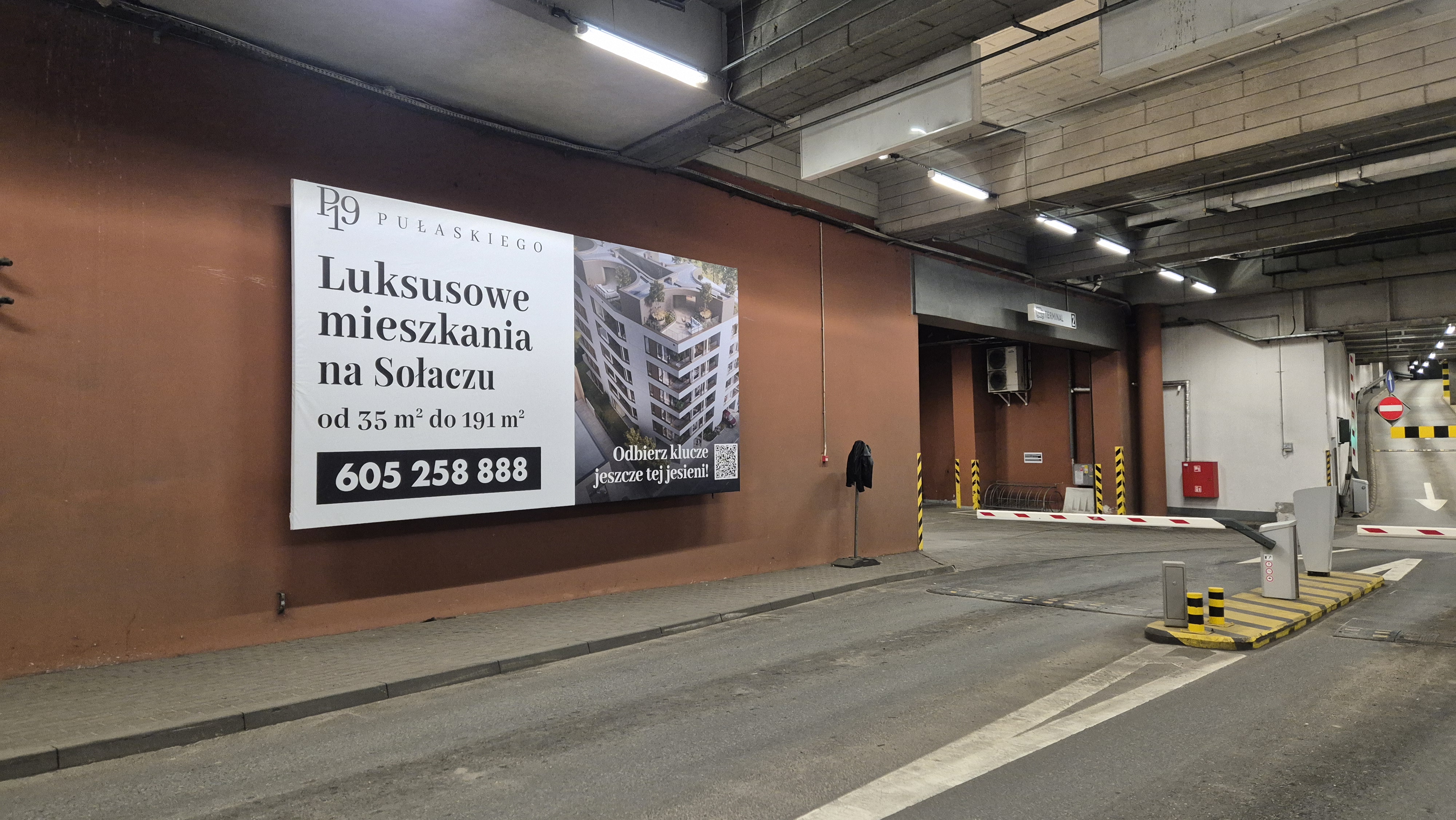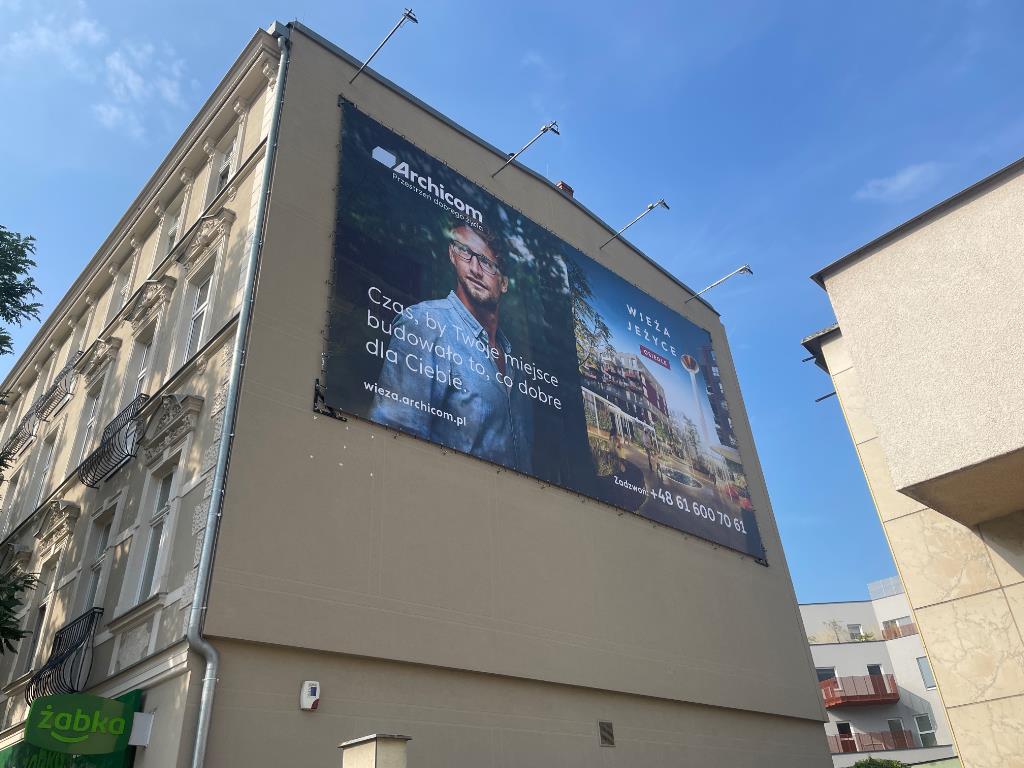 Banner z siatki Mesh, mocowany do rusztowania na budynku
